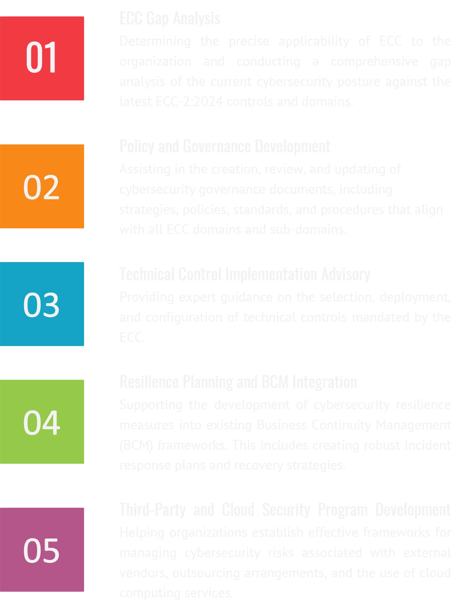 1. Our experienced team provides a structured and comprehensive approach, starting with a detailed Gap Analysis and Security Testing to assess your current cybersecurity controls against the ECC requirements.